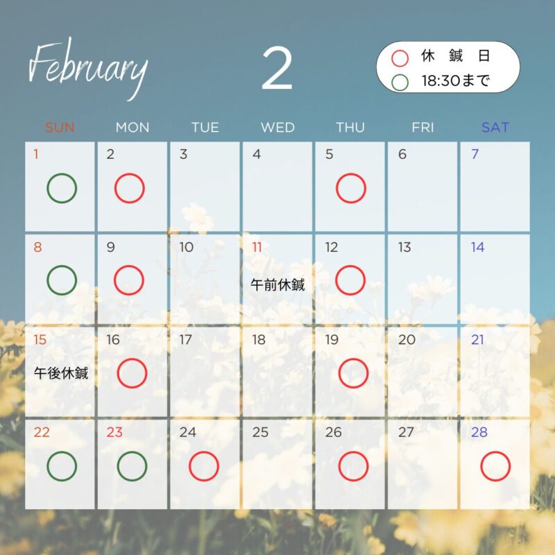 2月の鍼療時間のお知らせ お知らせ 2026.01.27 2月はカレンダーの通り、鍼療いたします。 11日(祝):午前休鍼第3日曜:午後休鍼第4土曜:休鍼とさせていただきます。 今後とも楽陽堂鍼灸院をよろしくお願いします。 院長 山口